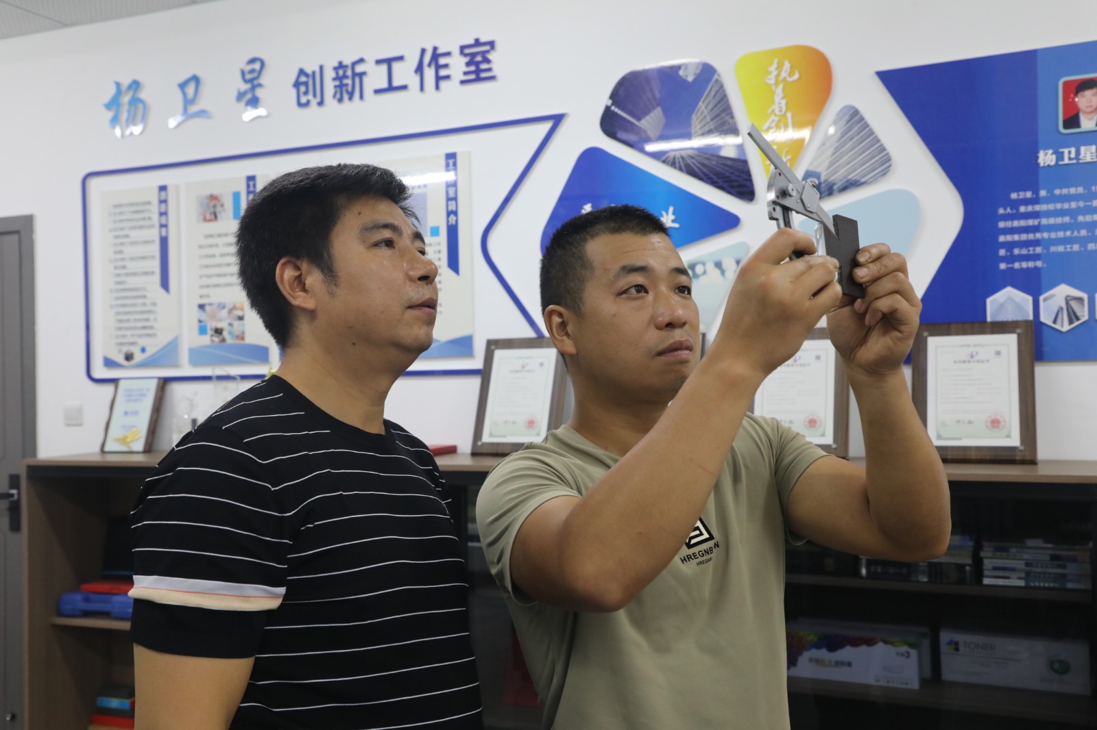 培训中,杨卫星采用实物对照图纸的方式,系统讲解燕尾槽加工前处理、凸件与凹件制作流程、工件质量检查方法与技巧等内容,着重强调配合要求、形位公差、表面粗糙度等关键技术要点。测量环节,他演示与指导结合,详细讲解正旋规量具测量原理、量块高度计算方法及注意事项,手把手传授精密量具测量技巧,确保学员掌握操作要领。此外,他结合外出参赛和“五小”技术创新经验,剖析钳工技术发展变化,分享新思想、好经验,积极弘扬劳模精神、劳动精神和工匠精神。参培钳工收获满满,对技术革新充满信心。